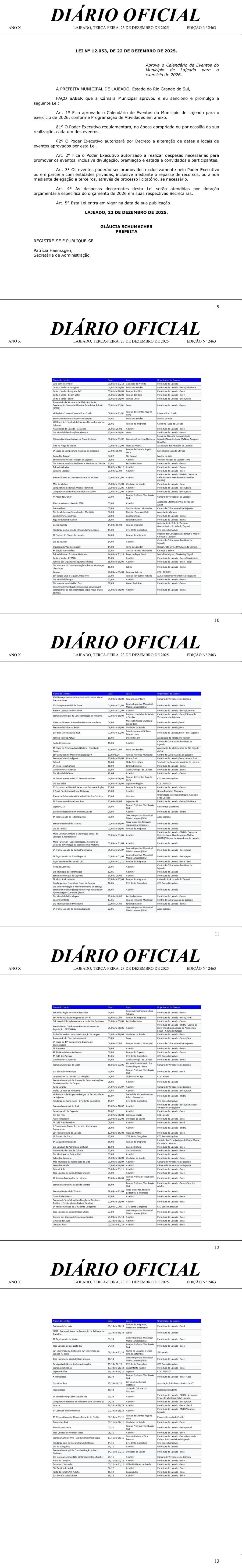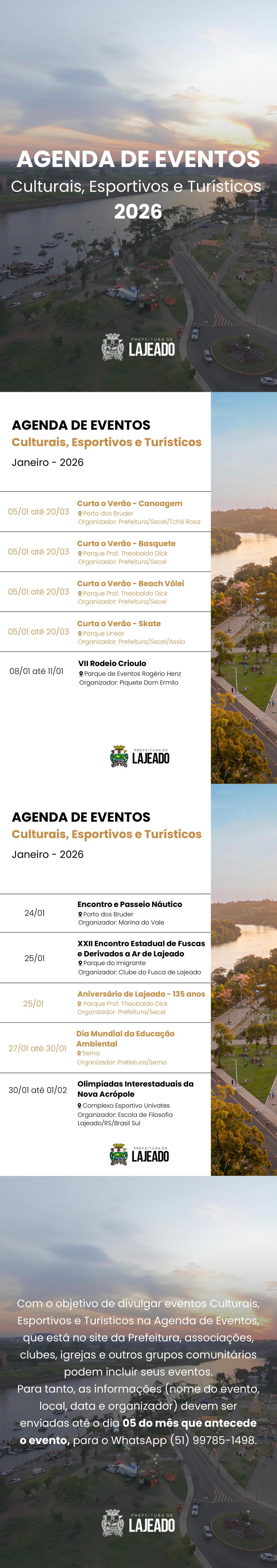 Agenda de eventos: Divulgação de eventos culturais, esportivos e turísticos que acontecem em Lajeado, e que não necessitam estar descritos na lei.Calendário de Eventos: A lei nº 12.053, aprova o Calendário de Eventos do Município de Lajeado para o exercício de 2026 (saiba mais).