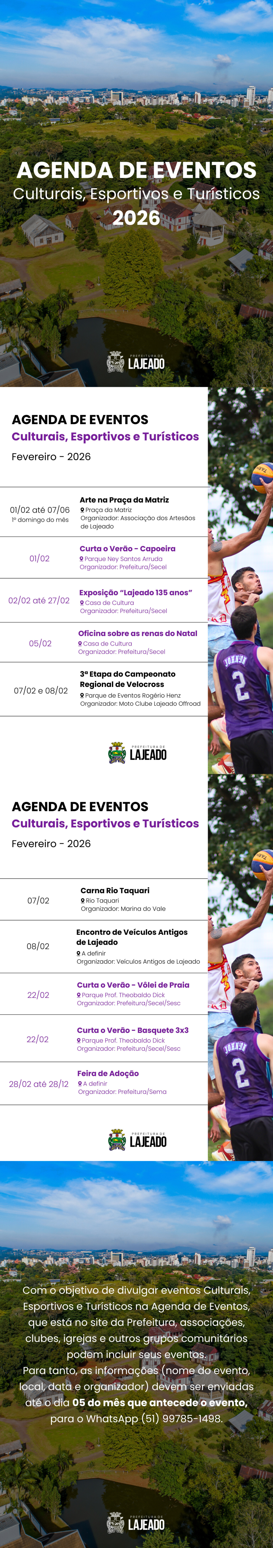Agenda de eventos: Divulgação de eventos culturais, esportivos e turísticos que acontecem em Lajeado, e que não necessitam estar descritos na lei.Calendário de Eventos: A lei nº 12.053, aprova o Calendário de Eventos do Município de Lajeado para o exercício de 2026 (saiba mais).