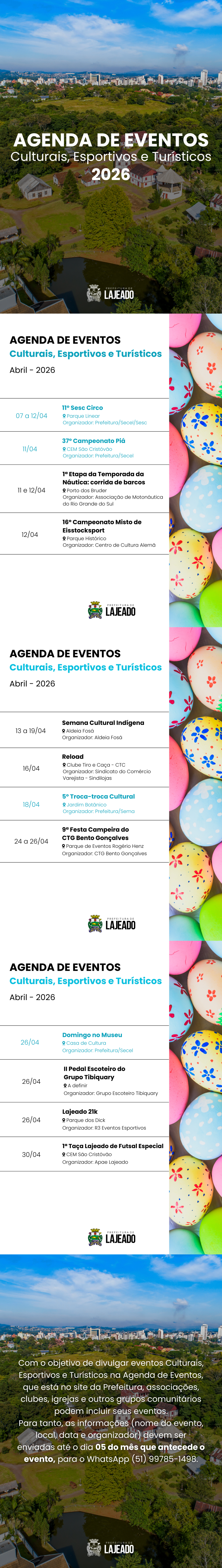 Agenda de eventos: Divulgação de eventos culturais, esportivos e turísticos que acontecem em Lajeado, e que não necessitam estar descritos na lei.Calendário de Eventos: A lei nº 12.053, aprova o Calendário de Eventos do Município de Lajeado para o exercício de 2026 (saiba mais).