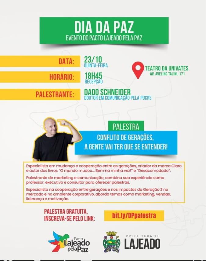 A Prefeitura de Lajeado, por meio do Pacto Lajeado Pela Paz, realiza dois eventos para marcar o Dia da Paz, que foi celebrado mundialmente em 21 de setembro. A programação do Dia da Paz será com duas palestras, realizadas no dia 23 de outubro, uma quinta-feira. A primeira será às 9h, no Auditório do Sicredi, e a segunda às 18h45 no Teatro da Univates. As palestras são abertas à comunidade e tem entrada gratuita.