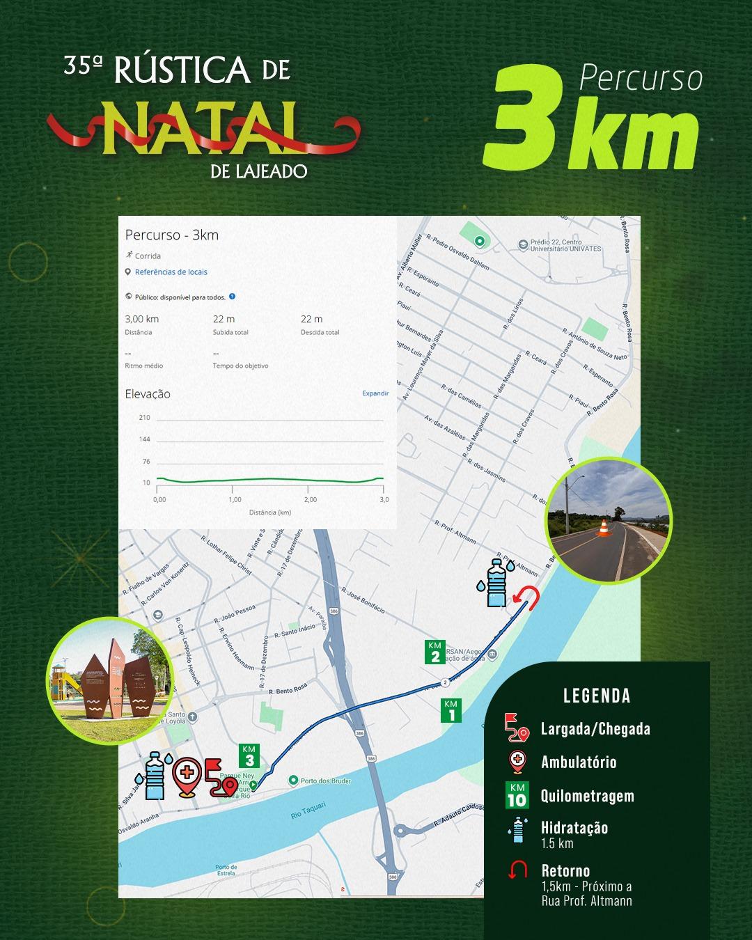 A 35ª edição da Rústica de Natal de Lajeado ocorre no dia 7 de dezembro, um domingo, e os trajetos da prova foram definidos e divulgados. O evento de corrida e caminhada integra a programação do Natal no Coração 2025. O evento é promovido pela Prefeitura de Lajeado, por meio da Secretaria de Cultura, Esporte e Lazer (Secel), e pelo Sesc Lajeado. Neste ano, o ponto de largada e chegada será no Parque Ney Santos Arruda.