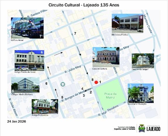 A Prefeitura de Lajeado, por meio da Secretaria da Cultura, Esporte, Lazer e Turismo (Secel), realiza o Circuito Cultural, no dia 27 de janeiro, uma terça-feira, às 18h30, para comemorar os aniversários do Arquivo Histórico Municipal de Lajeado, celebrado em 12 de janeiro, da Biblioteca Pública Municipal João Frederico Schaan, em 25 de janeiro, e da cidade de Lajeado em 26 de janeiro.