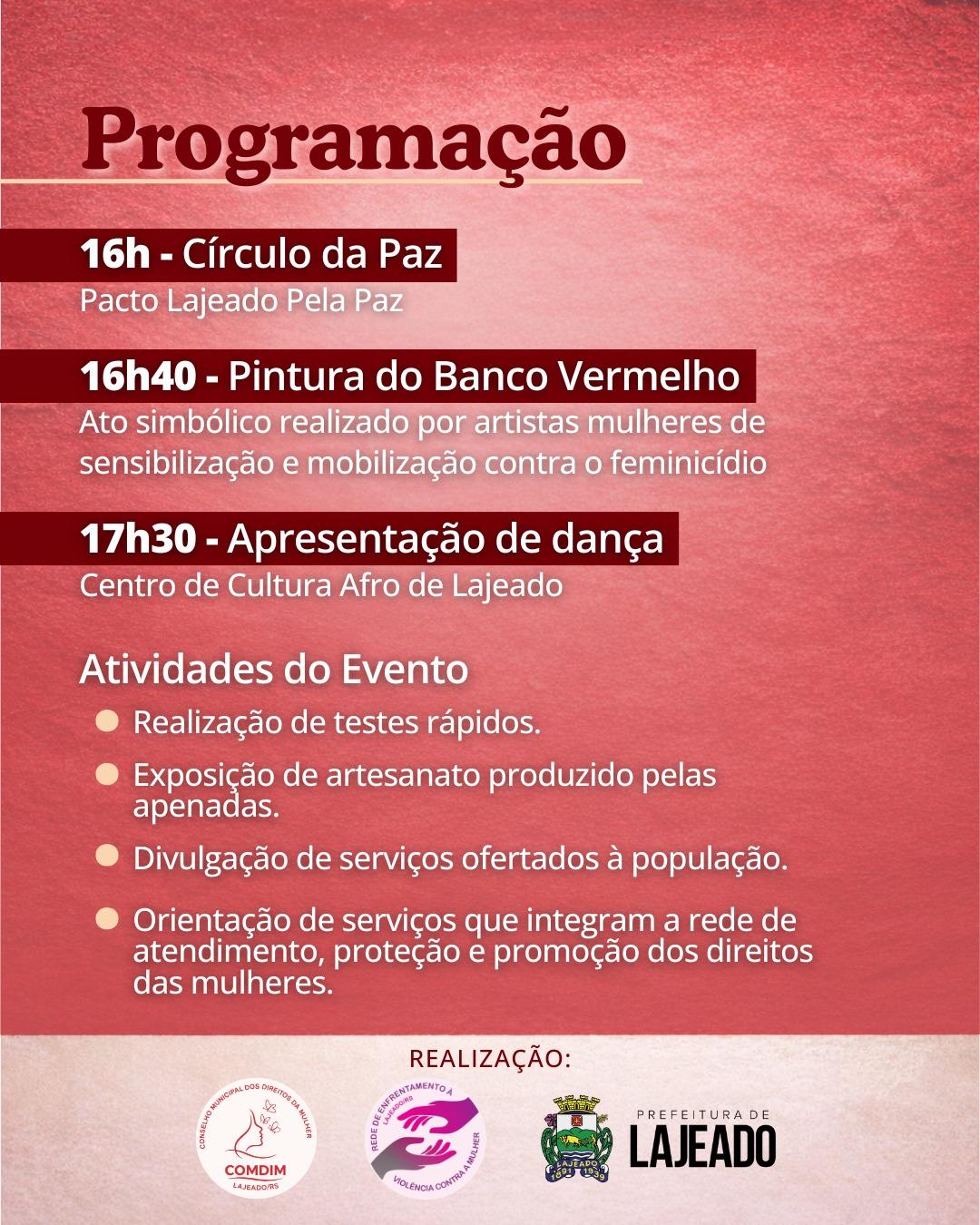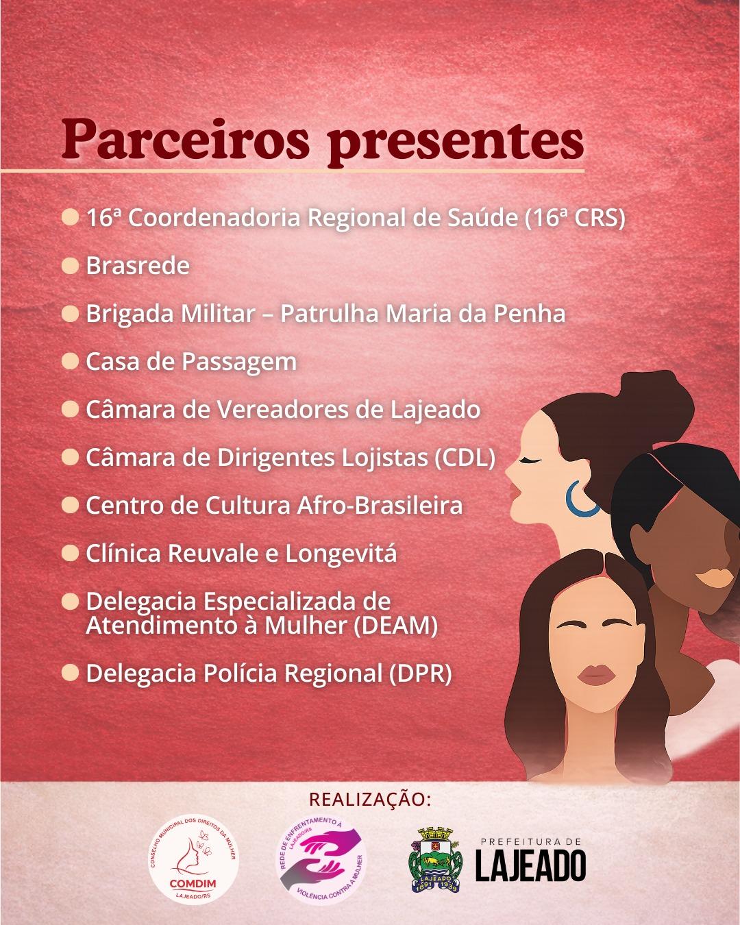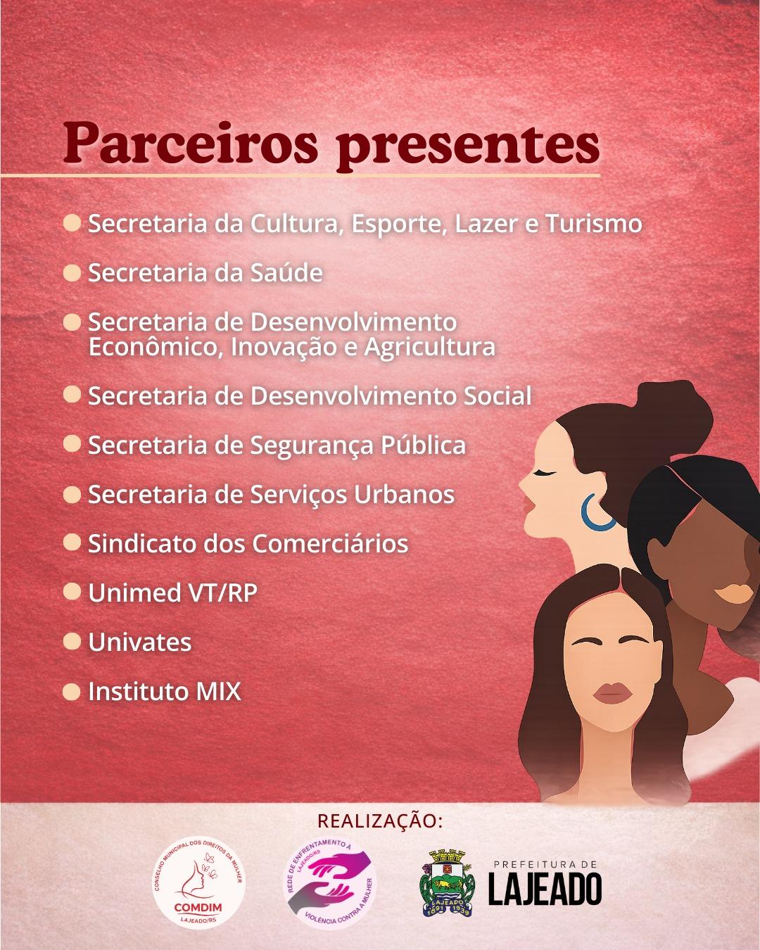 O evento é promovido pela Coordenadoria dos Direitos da Mulher, da Prefeitura de Lajeado, em parceria com o Conselho Municipal dos Direitos da Mulher (COMDIM) e a Rede de Enfrentamento à Violência contra a Mulher.