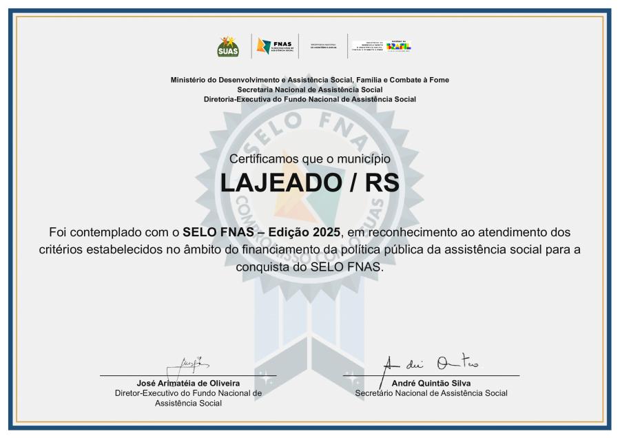 O município de Lajeado foi contemplado com o SELO FNAS – Edição 2025, do Fundo Nacional de Assistência Social, em reconhecimento à excelência dos serviços prestados na área da assistência social. O Selo certifica que o município atendeu os parâmetros de execução financeira, orçamentária, contábil e regulatória. O objetivo é estimular as gestões públicas da Política de Assistência Social a qualificar as suas ações nessas áreas, certificando os entes que priorizem o aprimoramento e gerenciamento do orçamento, financiamento e a execução da Política de Assistência Social nas Proteções Sociais Básica e Especial.